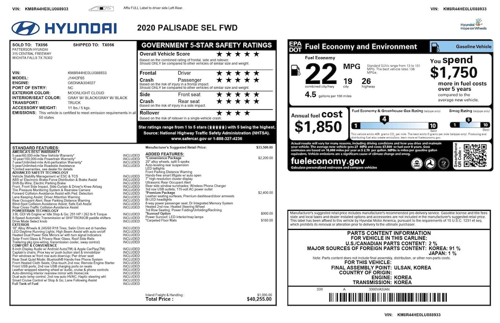 This 2020 Hyundai Palisade SEL Moonlight Cloud with a Black/Gray interior. No Accidents!