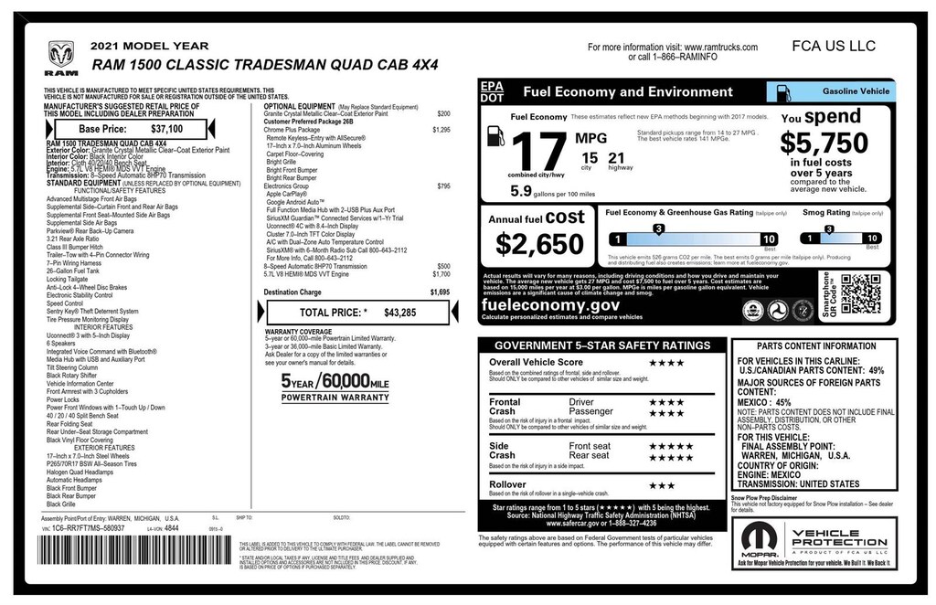 This 2021 Ram 1500 Classic Tradesman Granite Crystal Metallic Clearcoat with a Black interior. One Owner!